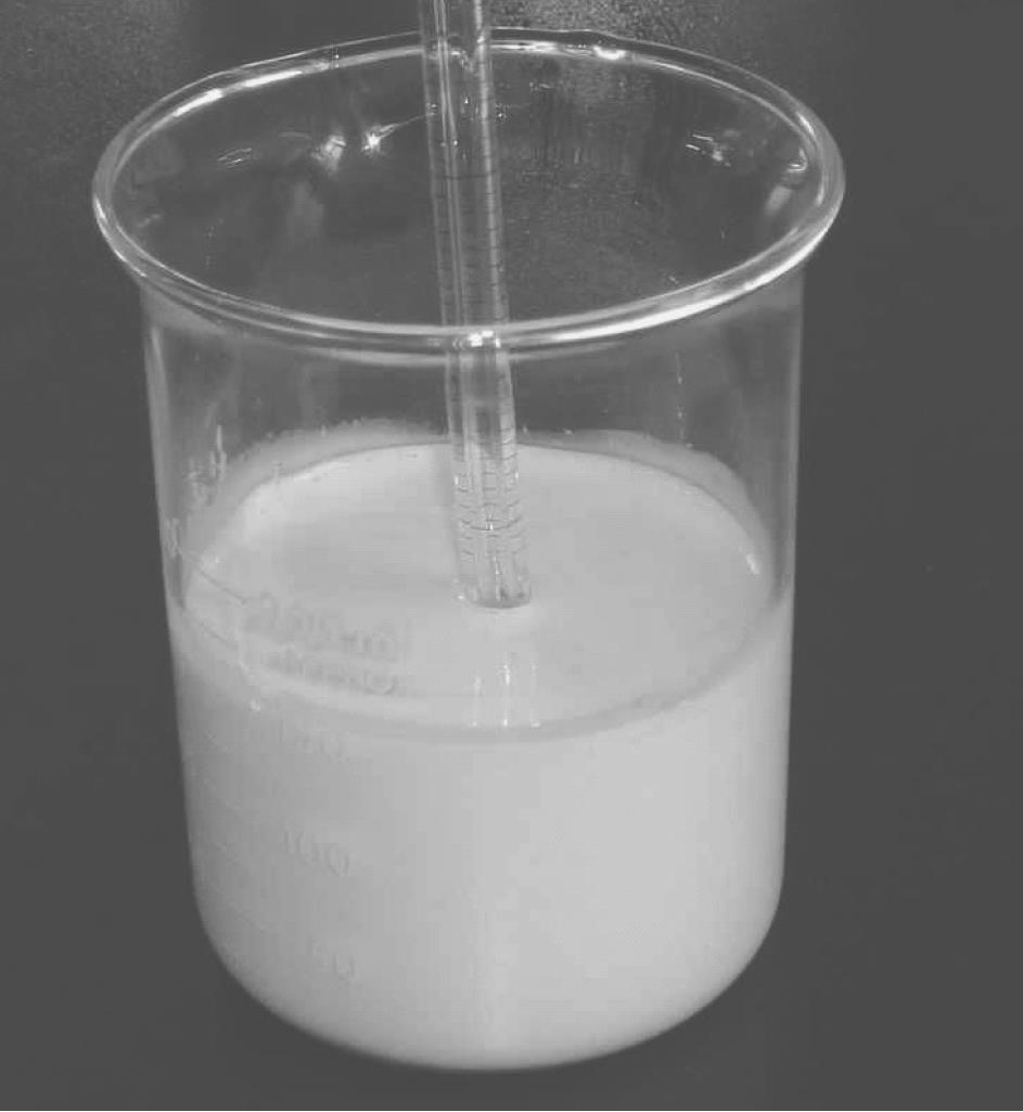 悬浮剂(aqueous suspension concentrates,代码SC)又称水悬浮剂或胶悬剂,是一种不溶于水的固体原药分散悬浮在含有多种助剂的水相介质中的胶状液体制剂,见图1-5。由于悬浮剂没有像可湿性粉剂那样的粉尘飞扬问题,不易燃易爆,粒径小,生物活性高,密度较大,包装体积较小,相对其他农药剂型安全环保、使用方便,因此,悬浮剂已成为水基化农药新剂型中吨位较大的农药品种。但是,悬浮剂也有一定的不足之处,如助剂系统较为复杂,配方研制较为繁琐,且悬浮剂有一定的黏性,易附着于包装物上,造成用药时的计量困难。