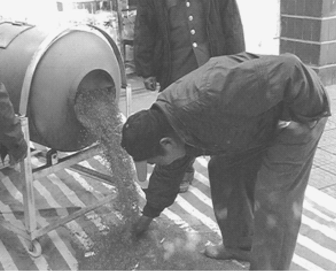 施粒法是指将颗粒剂撒施到一定范围内以防治植物病虫害的施药方法。对毒性高或易挥发的农药品种,不便采用喷雾和喷粉的方法,可以制备成颗粒剂来撒施。图1-25为徒手抛撒低毒农药颗粒剂。粒剂的颗粒粗大,撒施时受气流的影响很小,容易落地而且基本上不发生飘移现象。撒施可采用多种方法,如徒手抛撒(低毒药剂)、人力操作的撒粒器抛撒、机动撒粒机抛撒、土壤施粒机施药等。