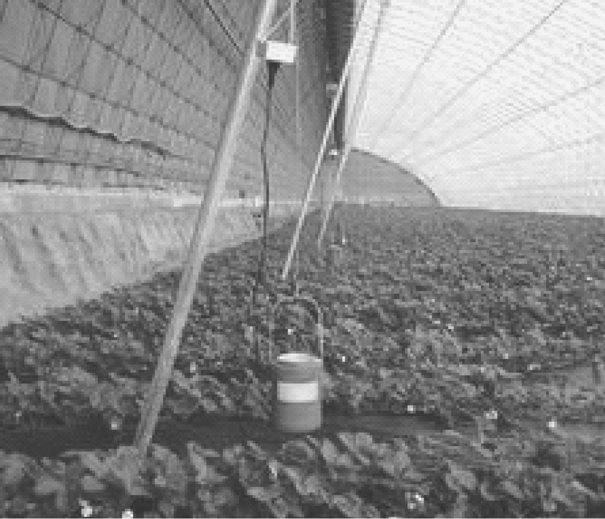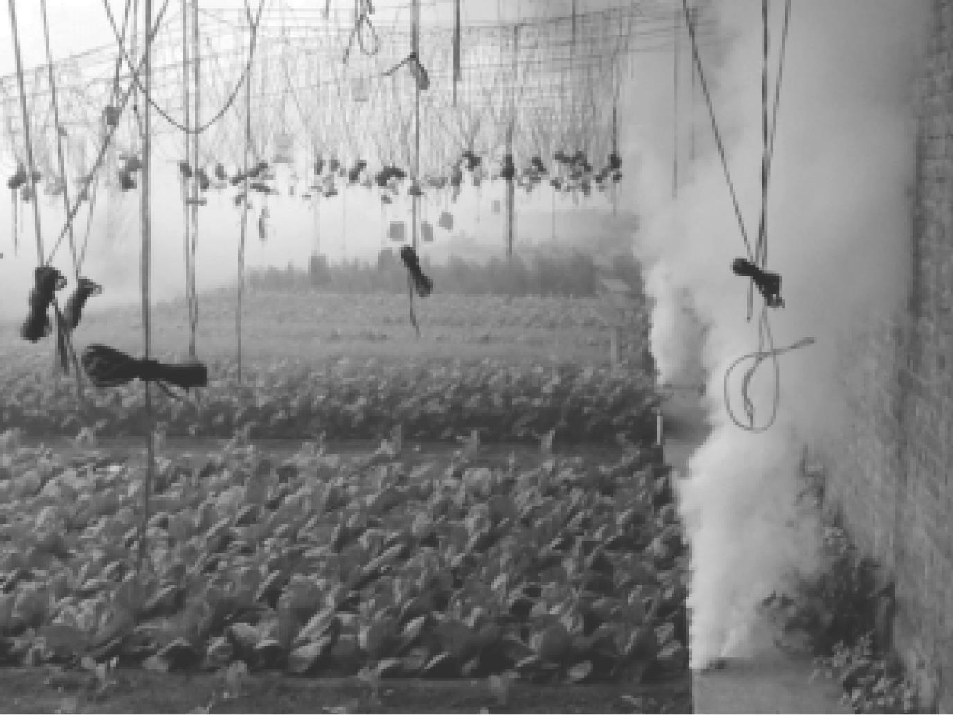 利用药剂产生有毒的气体,在密闭的条件下,用来消灭一些病害或具有较强迁移能力、隐蔽性强、不易被发现的害虫等。图1-23为温室内的熏蒸法。例如,如用敌敌畏制成毒杀棒施放在蔬菜枝杈上,可以熏杀白粉虱、烟粉虱、潜叶蝇等害虫。