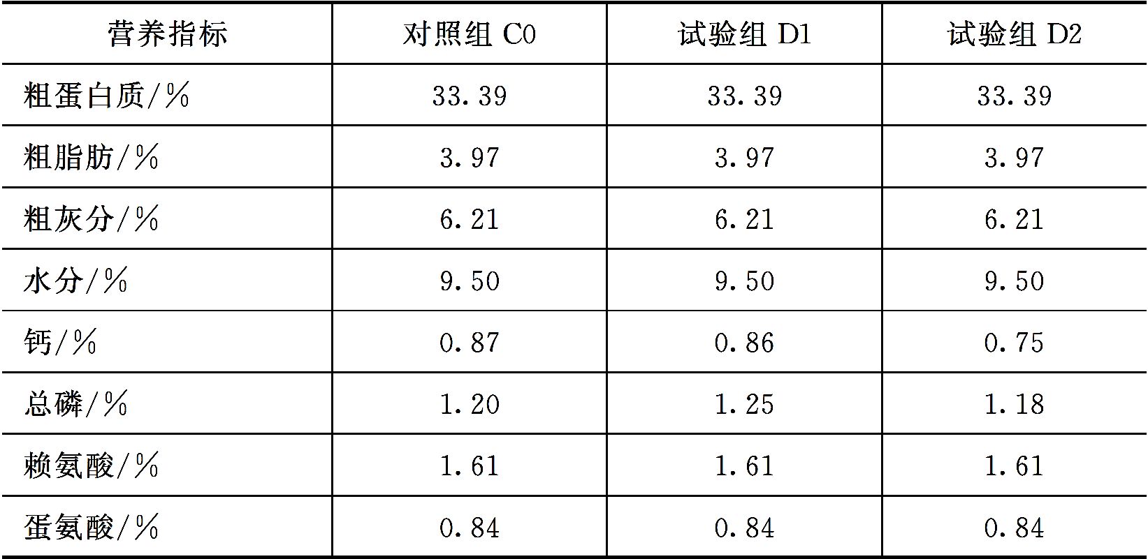 2.1.4 试验饲料:基础饲料主要由进口鱼粉、膨化豆粕、肉粉、花生饼、棉仁蛋白、菜粕、米糠粕、麸皮、次粉和豆油组成。对照组C0号添加1%的市售淡水鱼复合预混料+1%的磷酸氢钙+0.2%的沸石粉;试验组D1号添加由济南金三沅饲料有限公司生产的1.2%淡水鱼复合预混料+1%的磷酸氢钙,试验组D2号添加由济南金三沅饲料有限公司生产的2.2%淡水鱼复合预混料。各组饲料配方见表2-1。