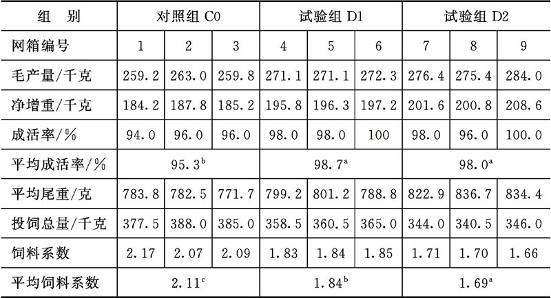 注:表中a、b、c表示实验组与对照组的平均成活率、平均饲料系数有显著性差异。