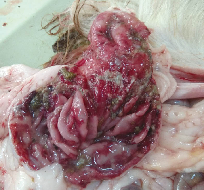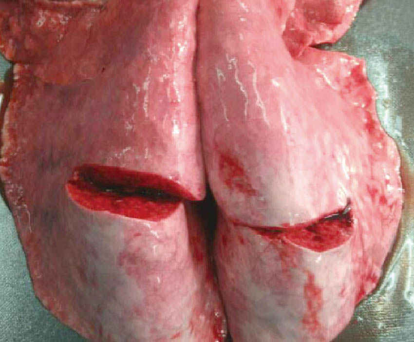皮下有液体浸润和点状出血;胃肠道黏膜水肿、溃疡和弥漫性出血(图1-2-1、图1-2-2);胸腔内有黄色渗出物;肺淤血、水肿、出血(图1-2-3),常见纤维素性胸膜肺炎;肝脏肿胀、淤血;心包积液,主要是黄色的混浊液体。