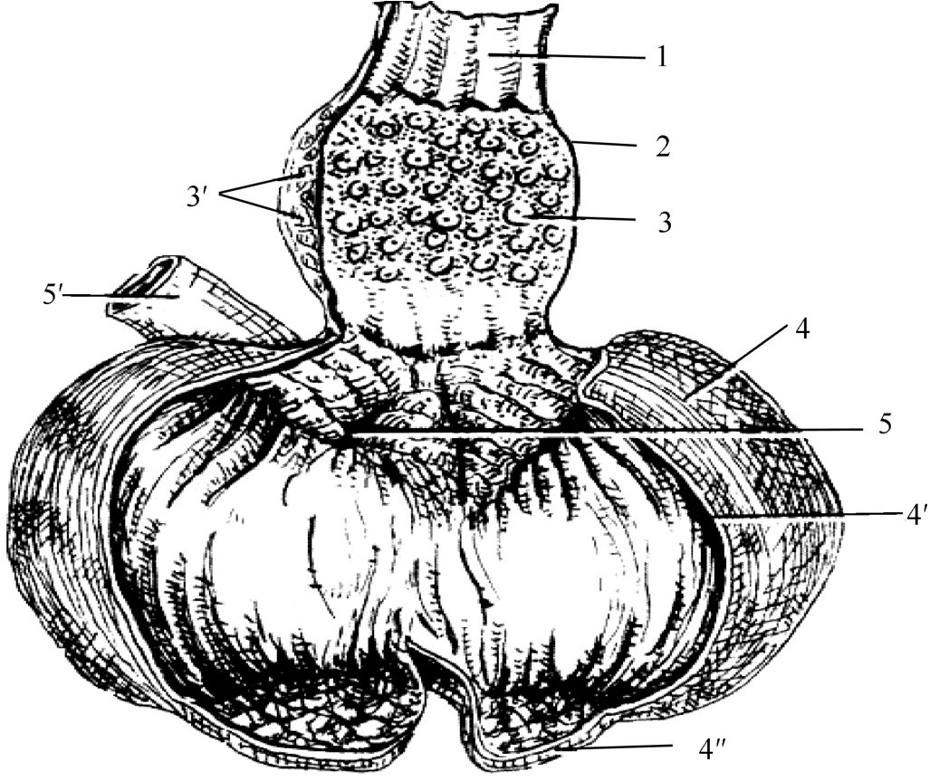 1—食管;2—腺胃;3—乳头及前胃深腺开口;3'—深腺小叶;4—肌胃的厚肌;4'—胃角质层;4″—肌胃后囊的薄肌;5—幽门;5'—十二指肠