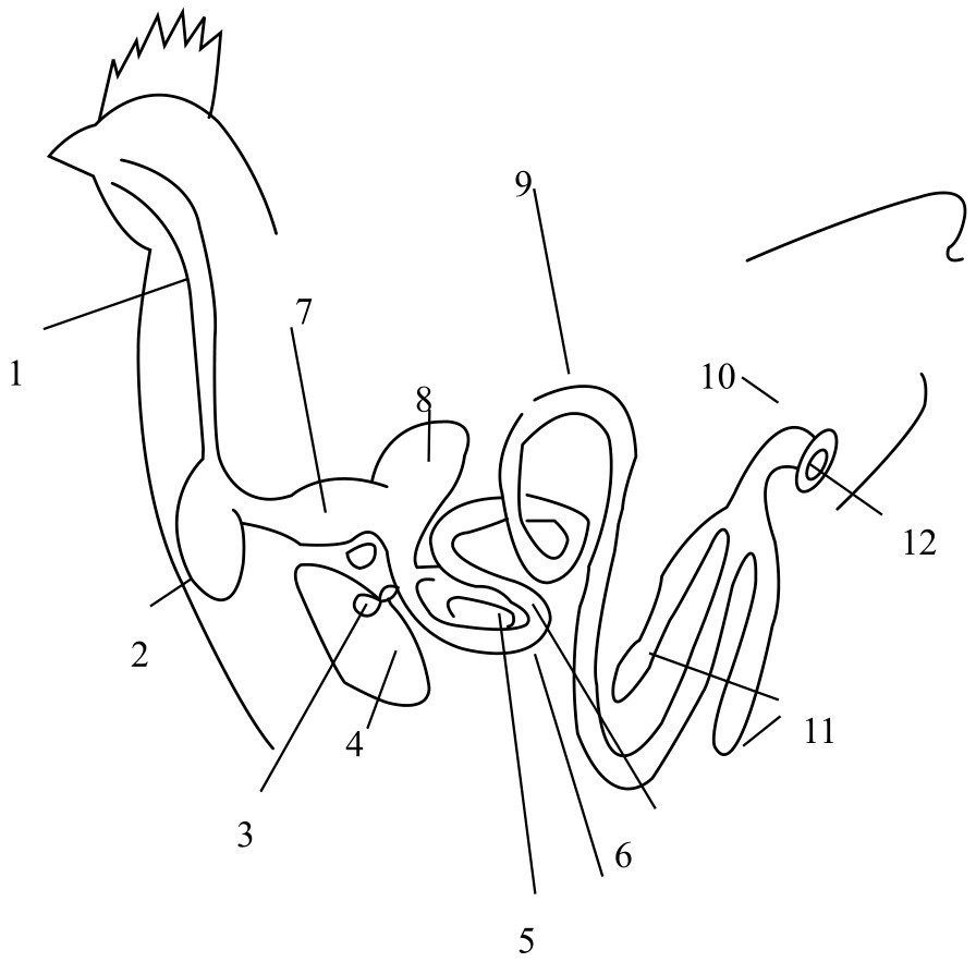 1—食道;2—嗉囊;3—胆囊;4—肝脏;5—胰腺;6—十二指肠袢;7—前胃(腺胃);8—肌胃;9—小肠;10—大肠;11—盲肠;12—泄殖腔