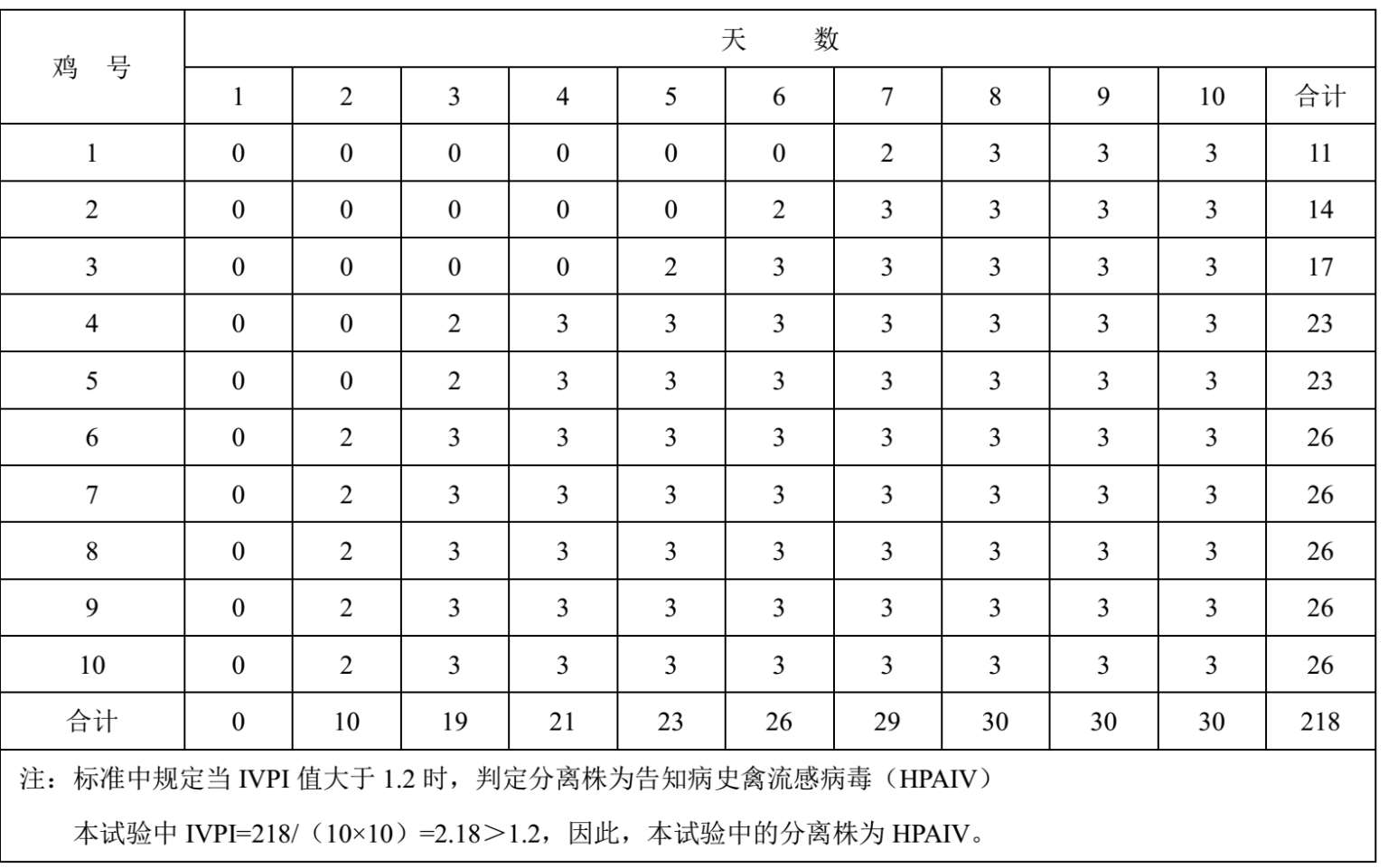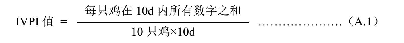 2.4.1.4 每日观察每只鸡的发病及死亡情况,连续观察10d,计算IVPI值。计算方法参见附录A。