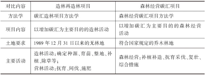 表2-1 森林经营碳汇项目与造林再造林项目对比