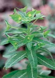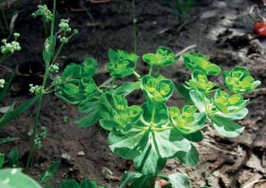 外观:一年生草本,株高10~30厘米。全株含乳汁,多分枝,基部带紫红色,上部淡绿色。枝叶:单叶互生,叶片倒卵形或匙形。花朵:茎顶端有5片轮生的叶状苞片,与茎叶相似,但较大;多歧聚伞花序顶生,有5个伞梗,每个伞梗再分2~3个小伞梗,分枝处有3枚轮生倒卵形苞叶。花径约1厘米。花期5~6月。果实:蒴果卵圆形,光滑无毛。