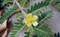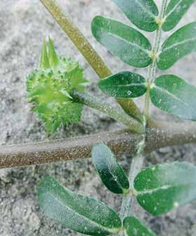 外观:一年生草本,平卧,被长柔毛或长硬毛。枝叶:偶数羽状复叶,小叶对生,3~8对,矩圆形或斜短圆形,被柔毛,全缘。花朵:腋生,花梗短于叶;花黄色,花瓣5片;雄蕊10个。花径2厘米,花期6~7月。果实:黄白色或淡黄绿色,有纵棱、多数疙瘩状小短刺及粗硬刺;果整体放射状排列呈五棱状球形。