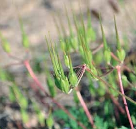 外观:多年生草本。根茎:茎棕红色或绿色,多分枝,长50~120厘米,具纵棱,被柔毛。枝叶:叶对生,叶片卵形或椭圆状三角形,长4~6厘米,2回羽状深裂;小羽片线形,具3~5个锯齿,两面被毛;叶柄长3~5厘米。花朵:伞形花序腋生,具2~5朵花;花瓣倒卵形,淡紫色或紫蓝色,长约8.5毫米;花丝粉红色。花期5~6月。果实:蒴果,宿存花柱形成长喙,喙长2~4厘米。