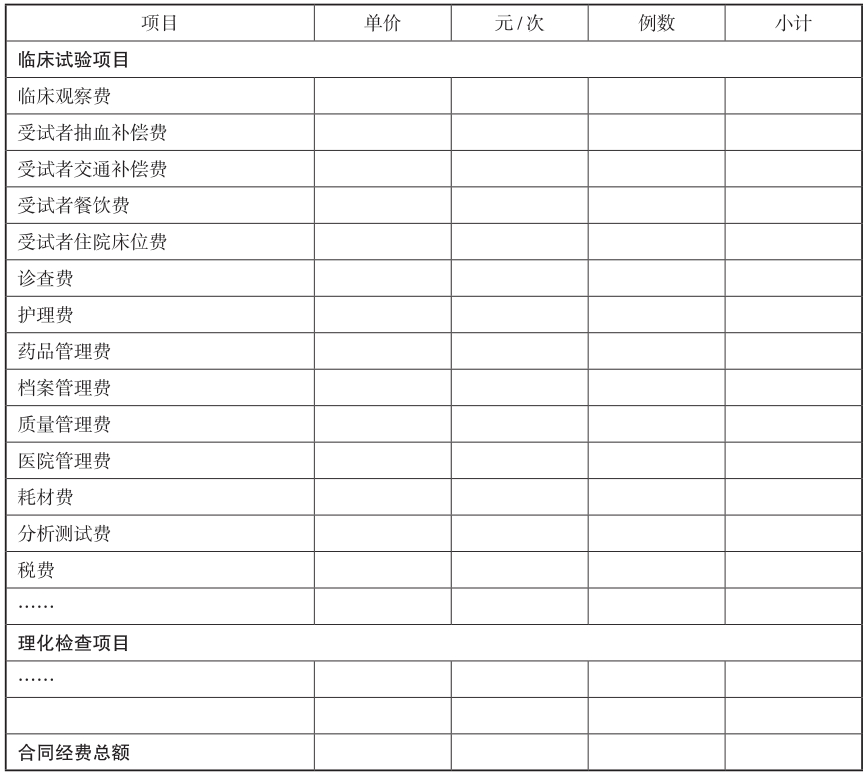 1.合同起草 主要研究者、机构项目管理人员/办公室主任负责与申办者或CRO洽谈临床试验合同。合同的内容包括但不限于:协议条款、明确申办者和CRO、研究者的各方职责,列明有关受试者保护的条款、保密责任、文章发表及知识产权、临床试验实施要求、研究物资供应、保险、由试验所致损害的相关赔偿、研究经费预算及支付方式等。经费应列出项目金额明细,涵盖Ⅰ期与生物等效性临床试验的所有款项,如受试者费用,包括补偿费、交通费、误工费、餐饮费、理化检查费、住院费、护理费、诊查费等;耗材费;研究劳务费,包括临床观察费、研究助理费、受试者招募费、培训费、夜班费、加班费、药品管理费、档案管理费/保管费(超过5年)、质量管理费、方案及附属文件设计费(如有)、总结及审核费(如有)、样品检测费(如有)等;医院管理费;系统维护费(临床试验用软件的配备和更新和维护等,如有);相关税费等。根据机构的具体情况,伦理审查费用可以另行签署合同或列入项目的合同。