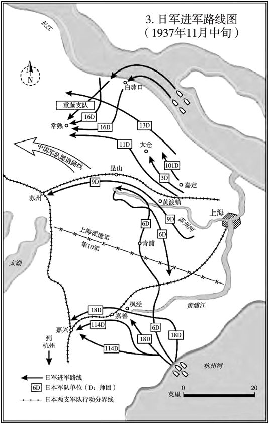 仅在一周前的11月4日,日军第10军在上海南边的杭州湾实施了一次突然登陆。这个军事行动的消息传来,蒋介石气得几乎处于半瘫痪状态。一旦登陆后,日军就进展神速,即将切断还在上海作战的中国军队的退路。尽管这个行动本身就令人恐慌,但蒋介石感觉到日本人的计划甚至比这更加雄心勃勃。他研究了地图,注意到日本人将如何扫荡太湖以南的地区。这将使他们非常危险地接近首都。蒋介石在11月11日的日记中写道:“(甚虑敌军由嘉兴出宜兴)威胁我南京也。”[54]
