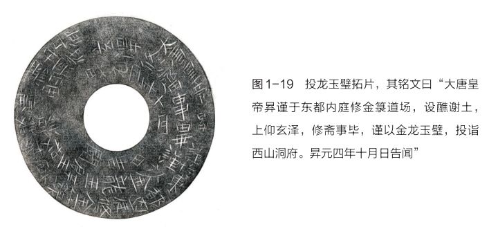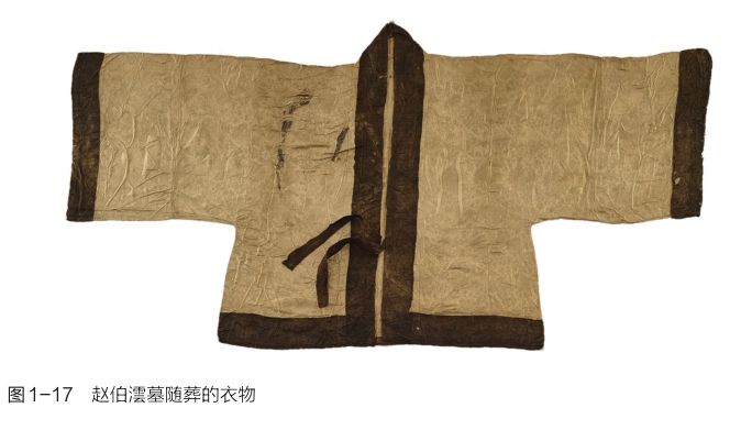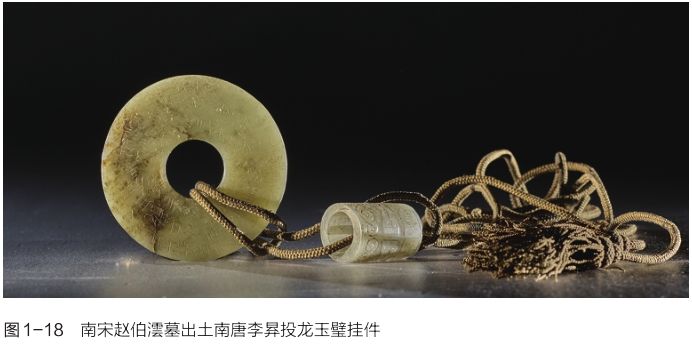 赵伯澐系宋太祖七世孙,南宋初,其父赵子英徙居台州黄岩,遂为邑人。赵伯澐生于绍兴二十五年(1155),卒于嘉定九年(1216),赠通议大夫。其墓保存完好,入殓时上身、下身各着八重衣物,尸骸与棺木之间塞满衣物,有衣、裤、袜、鞋、靴、饰品等,其中衣有圆领衫、对襟衫、交领衫、抹胸等(图1-17),裤有合裆裤、开裆裤、胫衣、裙裤等;饰品有帽、腰带等,织品包括绢、罗、纱、縠、绫、刺绣等,将棺木充塞紧实,正如《朱子家礼·丧礼》“大敛”所称,“共举尸纳于棺中,……又揣其空缺处,卷衣塞之,务令充实,不可摇动”。另有随身的玉璧、水晶璧挂件和一面带柄铜镜等随葬品。玉璧系南唐皇帝李昪投龙玉璧(图1-18),铭曰:“大唐皇帝昪谨于东都内庭修金箓道场,设醮谢土,上仰玄泽,修斋事毕,谨以金龙玉璧,投诣西山洞府。昇元四年(940)十月日告闻。”(图1-19)此件南唐玉璧在传世近300年后,作为赵伯澐生前雅玩得以随葬(43)。
