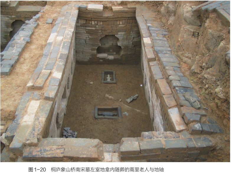 江西、四川、福建等地宋墓,尤其是富民阶层墓葬,随葬神杀俑像甚众,作为地方习俗不足为奇。而江浙宋墓中,则绝少发现,目前所见的考古材料,只有桐庐象山桥南宋墓为特例,其中、左墓室各出陶俑一组,于东、西两侧壁龛中置十二时神,于地龛中置蒿里老人和地轴(双人首蛇身俑)。该墓在浙江尚为孤例,与本土葬俗缺乏关联,应当纳入《宋史·礼志》二七《诸臣丧葬等仪》所描述的官方葬制系统中予以理解(52)(图1-20)。