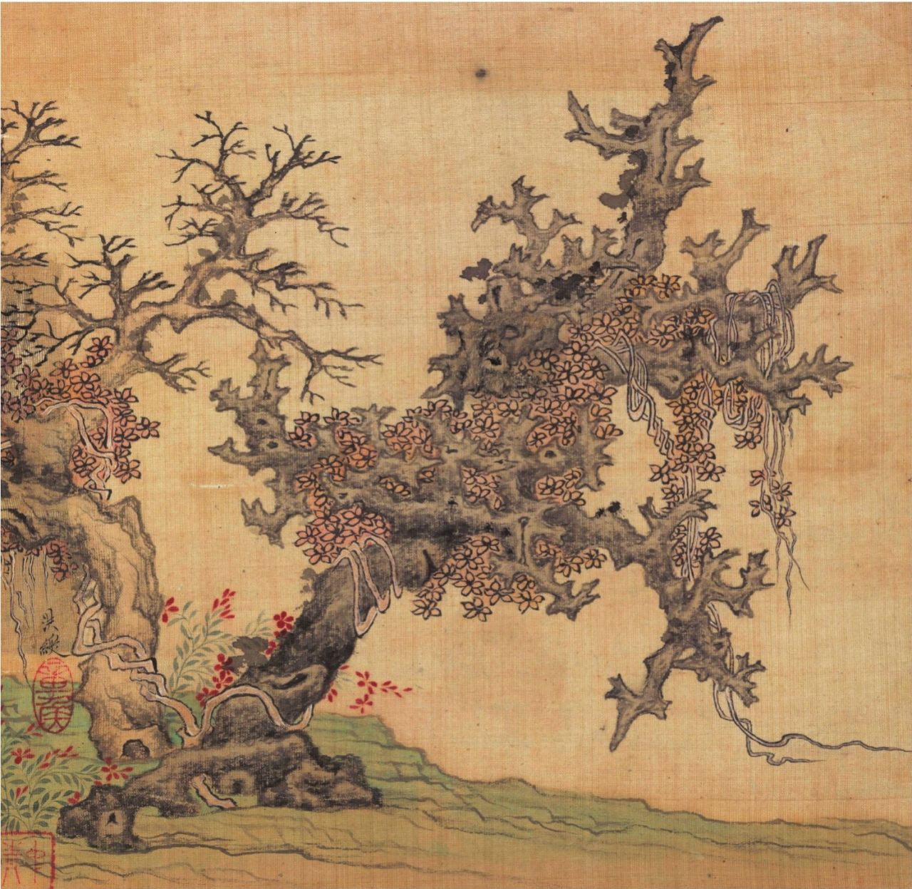 秋叶将落尽,新绿会萌生,枯木不开花,藤蔓缠上来,开出一片好花,生命还是在绵延。看陈洪绶《橅古双册》中的《古木茂藤图》,有莫名的感动,千年老树已枯,却有古藤缠绕,古藤上的花儿依枯树绽放—— 一种衰朽中的生机,一首生命不灭的轻歌。(图1-2)