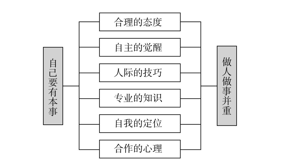 本事是什么?主要包括合理的态度、自主的觉醒、人际的技巧、专业的知识、自我的定位,以及合作的心理等六方面(详细的内容在后面将有比较具体的说明)。总括起来,可以说是“做人与做事并重”。换句话说,做人和做事能够双方面兼顾并重的人,才有资格被称为有本事的人(如图2-2)。