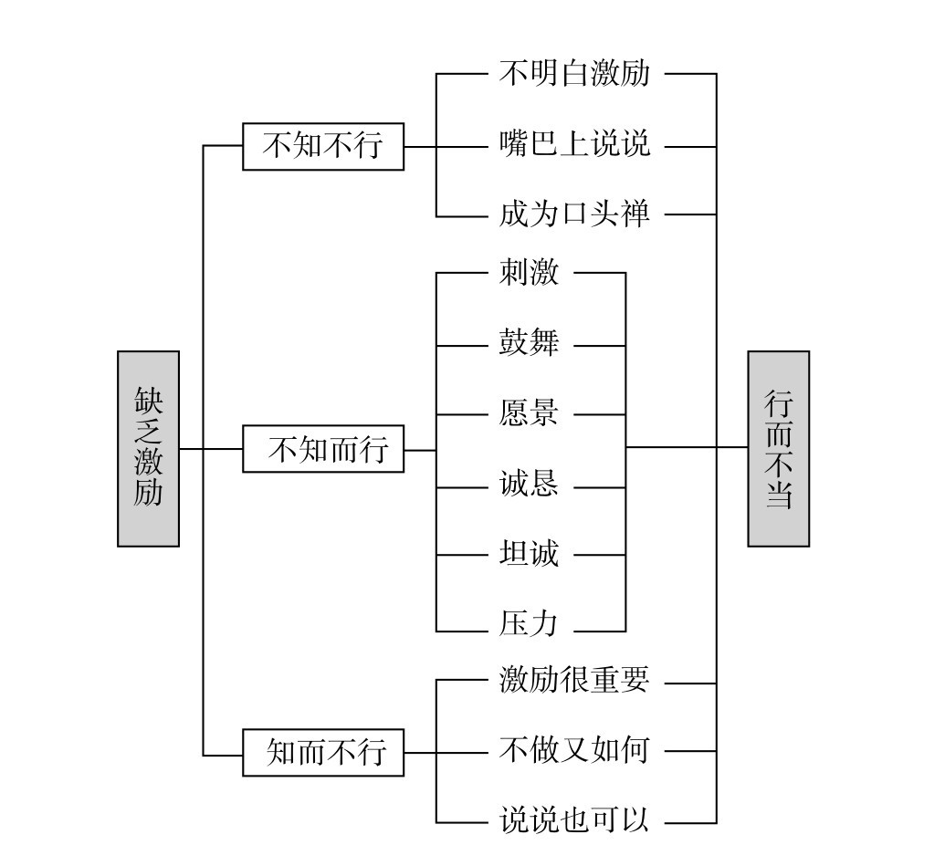 比如,“不知不行”。管理者不了解激励的真义,不能够深入探讨激励的本质,只是嘴巴上说说,而缺乏真正有效的措施。这种空口说白话的激励,实际上不能激励员工好好地表现。