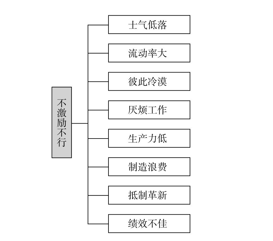 缺乏激励可能产生的不良现象,例如,士气低落;员工流动率过大;彼此之间漠不关心,没有人情味;大家厌烦工作,生产力降低;不用心、不专心,到处制造浪费;一动不如一静,抵制革新;等等。种种因素加在一起,就造成绩效不佳的可怕结果(如图1-2)。