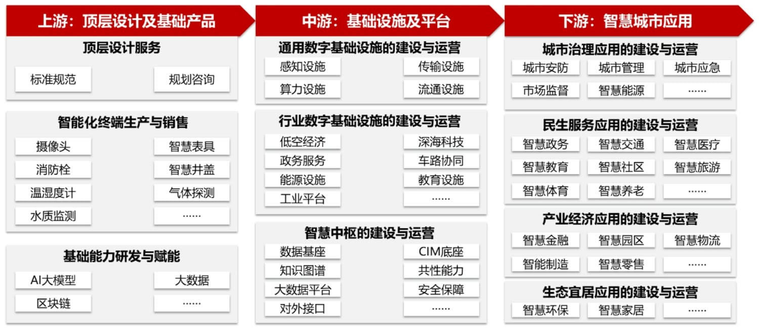 历经十余年的发展,智慧城市的产业链逐渐完善,有效支撑智慧城市的建设和运营。在城市全域数字化转型的发展中,相关产业链将继续发挥作用。基于城市全域数字化转型的业务结构,并结合产业实际,形成产业链结构图,如图1.3所示。